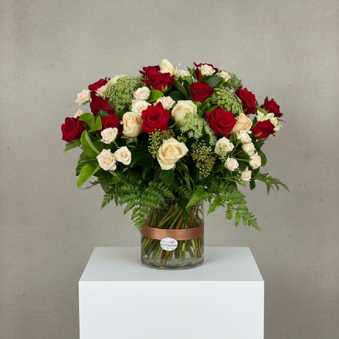 This vase arrangement will be made up to value with a combination of Cluster, Spray and Single Roses, it will be made with the combination that the floral designer decides is most beautiful on the day so colours may vary from the photo. If you have special requests please make a note in the notes section at checkout we will do our best to accommodate your request .