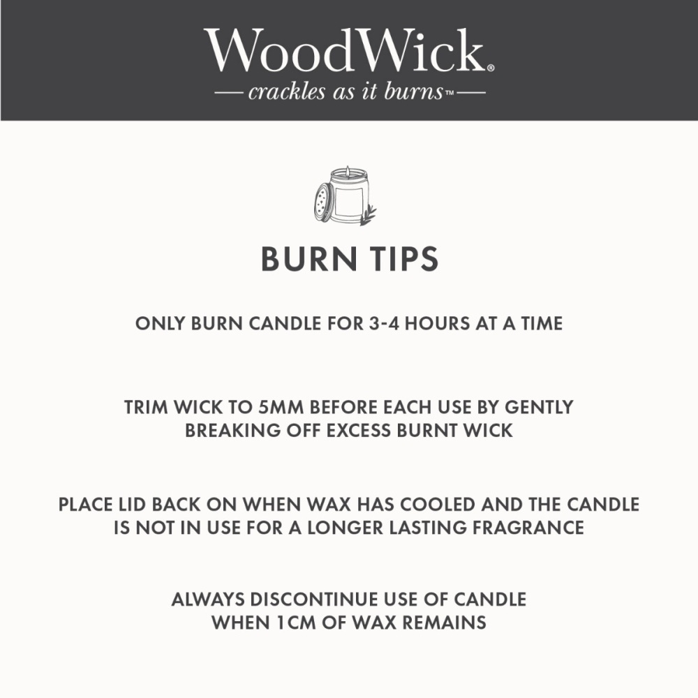 This medium candle has an impressive burn time of up to 60 hours.These luxuriously scented candles are the perfect gift choice. The WoodWick candle features an amazing natural wick made from organic wood that creates the soothing sound of a crackling fire when burning.  Using only a high quality soy wax blend and premium fragrance, each WoodWick Candle is carefully crafted by experienced candle makers passionate about creating the best candles possible.